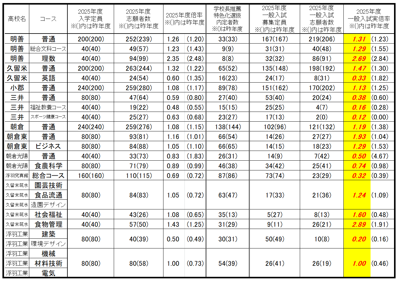 一方で久留米筑水高校は、例年よりもどの学科も倍率が大きくなっているので、注意が必要ですね。