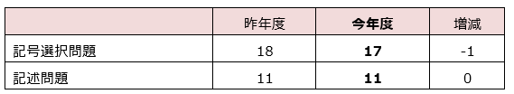 設問形式や出題傾向に大きな変化は見られず、難易度は昨年並みと考えられる。