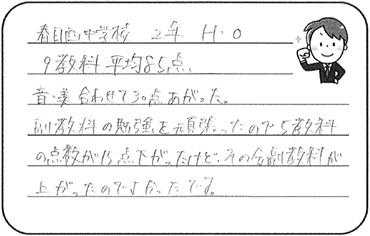 私は中学3年生の春に入塾しました。2年生の頃は気が緩んでいたのでテストでいい得点を出せずに悩んでいました。入塾してからは塾がない日も自習に行ったり、先生に質問をしたりして90点や80点をたくさんとることができました。先生方の解説がとてもわかりやすく裏ワザなども教えてもらい楽しく勉強できました。定期テストで高得点を取ることができた結果、通知表の点数もあがり特色化選抜を受験することができました。面接練習も何度も行ってくださり、本番は自信を持って臨むことができました。とてもありがたかったです。おかげで第一志望校に合格することができました。