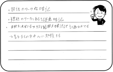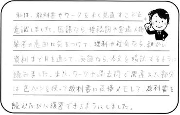 私は大濠高校の過去問題を、自分が受けた専願入試の問題だけでなく前期後期の分もすべて解き、やり直しノートを作って徹底して復習しまいした。スマホの誘惑に負けそうになるときは先生の顔を思い浮かべて、「先生も応援してくれているからがまん」と思いながら勉強を続けました。自分を強く保ち続けるのはたいへんでしたが、誘惑に負けず、先生の応援を励みにして、第一志望の高校に合格することができました。進路が決まった今も油断することなく勉学に励んでいます。