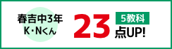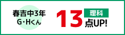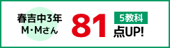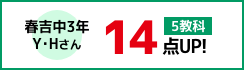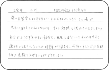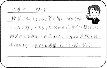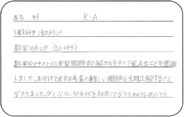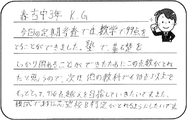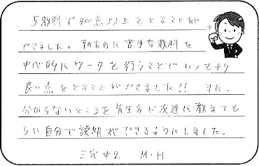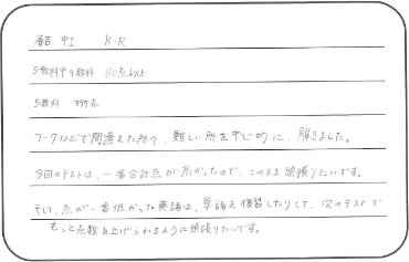 僕は中学1年生の冬に入塾しました。塾の先生たちはとても優しくて、分からない問題があっても質問しやすかったので、勉強がとてもはかどりました。学校の定期考査の日が近づくと、毎日塾に来て勉強。5教科の中で1番自信があるのは英語だったので、得意な英語を中心にどんどん勉強を進めた結果、定期考査の得点も実力テストの偏差値も上がり、受験学年になってもさらに努力を続けました。そして受験本番でも力を発揮することができたと思います。合格通知を見たとき、とてもうれしくて、努力し続けるって大切だなあと実感しましいた。次の目標に向かってまた努力を続けます!