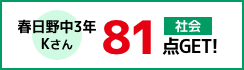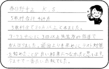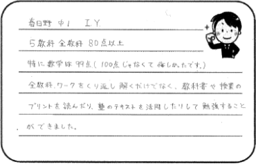 私は中学2年生の夏期講習から入塾しました。少しずつですが勉強のコツがわかってきて、自分にあった勉強方法をつねに模索しています。先生にはよく相談しています。親身になって話してくださるのでほんとうに頼っています!私立入試の勉強では過去問を解いたりするだけでなく問題集も解いていました。わからない問題があったらすぐに先生に聞きます。先生の解説はコンパクトにまとまっていてほんとうに分かりやすいです。おかげで理解力がアップしたという自信がついて、無事にB奨学生で合格することができました。これからも先生と二人三脚で頑張ろうと思います。先生、頼りにしています!