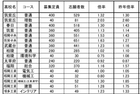 こちらは、前年度より倍率が上がっていた福岡中央高校に出願していた生徒が、筑紫高校に出願先を変更したのではないかと個人的には感じました。