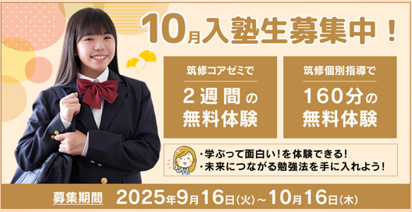 10月度入塾生、募集中です。 まずは無料の体験授業をお試しください。