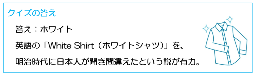 Tシャツは「Tの形」からだから、Yシャツも「Yの形?」と思いきや、「ホワイトシャツ」の聞き間違いからという面白いクイズでした。
