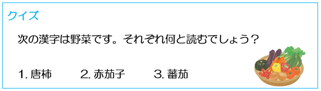 見たことのない漢字ばかりだと思いますが、みんなよく知ってる野菜です。
