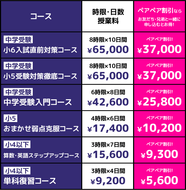 6年生は中学進学に向けて、国語・算数・英語の定着が必要です。冬休みから理解できていない内容を総復習すれば、中1のスタートに十分間に合います。中学校で部活との両立をしながら上位をキープするにはこの冬が重要です。総復習をして苦手箇所を克服しましょう。5年生以下は先取りのチャンスです。長期休暇中に学習習慣が途切れることを防ぎながら、勉強の楽しさを伝えます。