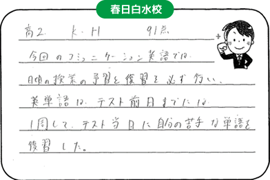 クラス名 到達度別クラス指導 コアゼミ 指導科目 数学・英語 担当講師 武田先生 学年 高校1年生 志望校 熊本大学 工学部 春休みの学習の目的 苦手分野を抜粋し、基本から丁寧に復習する。繰り返し問題演習を行い、確実に基本内容を定着させ、合わせて学習習慣の構築を行う。学年末考査範囲や外部模試対策を行い、3学期に成績向上を果たす。 各教科習得目標 数学 実数・絶対値…今後様々な分野で出題されることが多い。絶対値記号を外せるようになる。 2次関数・2次方程式不等式…式の決定・グラフ・最大値最小値は今後も繰り返し出題される重要分野のため、連続して学習することで体系的な理解を目指す。 三角比…高2三角関数の基礎となる分野。相互関係やθ-90°など繰り返し出題される分野なので公式の定着は必須。 場合の数…問題ごとにパターン化しやすい分野。一度得点源にできれば受験まで継続させることができる。現状でも入試レベルまで引き上げることが可能な分野の一つ。 ユークリッドの互除法…解法手順を定着させ、正確に答えを求めることができるようになる。 英語 文型…書き換えの問題では第4文型から第3文型への変換ができるようになる。 時制…どの問題でも関係する重要事項である。問題ごとに現在・過去・未来で動詞を適切に変化させることができるようになる。 不定詞・動名詞の用法…連続して学習することで体系的に理解し、定着させる。 分詞構文…高1生の大半が苦手とする分野。集中的に学習することで基本用法を理解し、慣用表現も含め使えるようになる。 関係詞…関係代名詞と関係副詞の基本的な用法を理解し、長文問題でスムーズに和訳できるようになる。