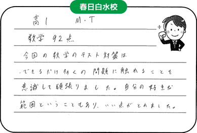 僕は数学が苦手で、コアゼミの授業では専用問題の中の基礎問題から取り組みました。単元ごとに細かくまとめて学習できるので力がついて、今は応用問題にステップアップしました。解いていてわからない問題があるとまず解説を読むようにしています。納得いかないところを先生に質問しにいき、謎が解けた!というかんじでわかると、先生はそこで説明をとめてくれます。分からないポイントがわかるとあとは自分で解けそうなので、そのあたりを先生はわかってくれています。少しずつ数学にも自信がついていき、定期テストや進研模試の対策もバッチリです。今は、自習室をたっぷり使って勉強しています。