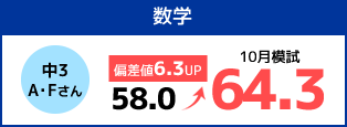 - 苦手な数学に集中的に取り組み、中1内容から3ヶ月間でやり直したところ、苦手意識がすっかりなくなりました。