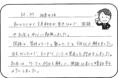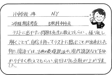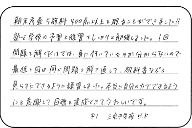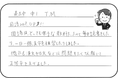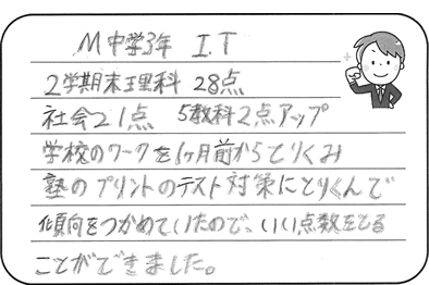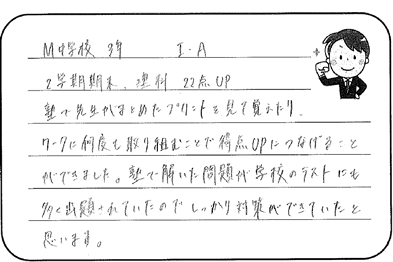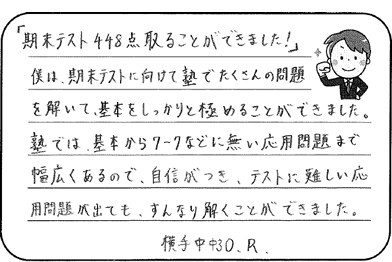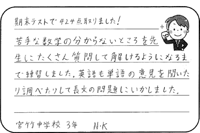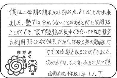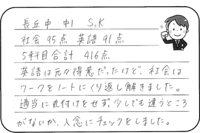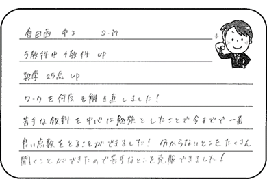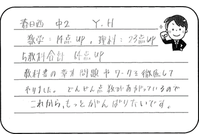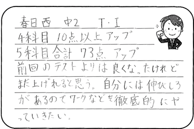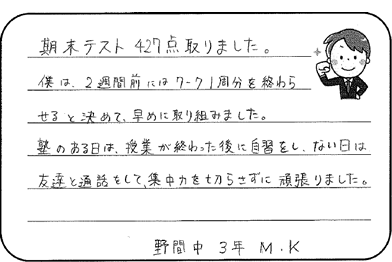 小学生のときから塾に通っていて、英検にチャレンジするのを勉強の目標にしてがんばっています。英語のアプリで勉強できるので助かっています。対策問題や問題集についている模擬テストを解くのは時間がかかるけど、アプリは5分とか10分ぐらいでもできます。発音を採点してくれるのでもっと点数をあげたくて何回か発音しています。授業では先生はわかりやすい説明をしてくれて、宿題もしっかり出してくれます。数学もがんばろうといわれたので、英語と同じようにがんばらないといけないと思うようになりました。