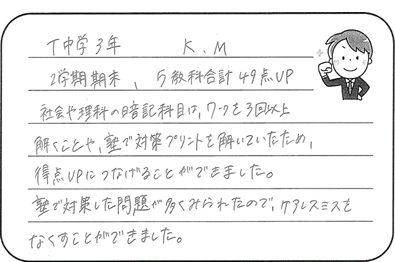 中2の学習内容は入試で出題される範囲が多く、とても重要です。公立入試では、知識に加え思考力を問う問題が増えてきています。早めに知識を定着させ、その知識を使って考える習慣を身につけたいものです。理解不足のままになっている内容の総復習と思考する練習を春休みから本格的に始めましょう。弱点克服ができたら積極的に新学年の予習を行いましょう。